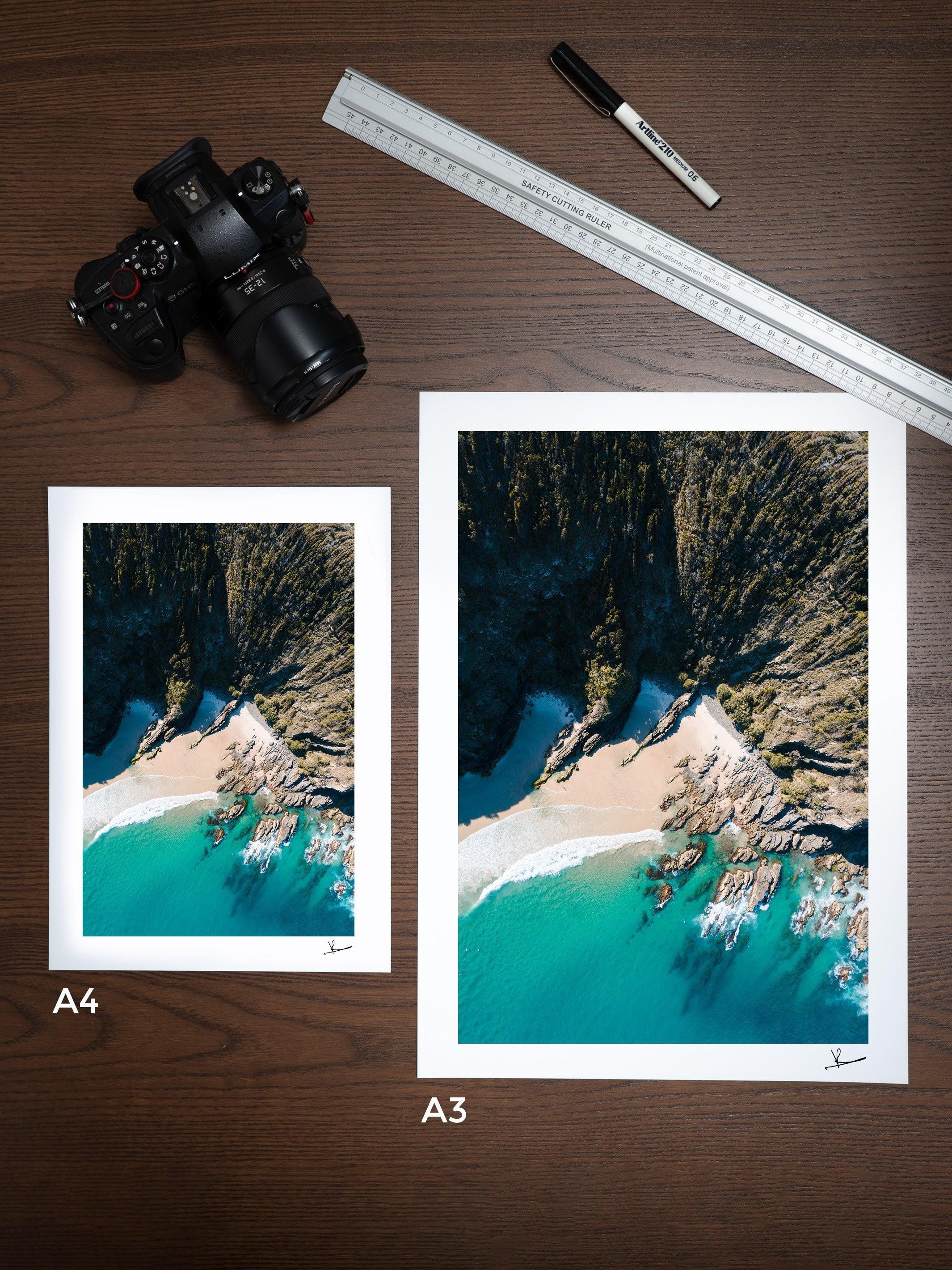 Each of our prints features a white border, enhancing their aesthetic appeal. We do not use mats. The sizes mentioned are for the print and border combined. If you choose a frame, the total size will be a bit bigger due to the frame's thickness, which is between 2 to 3 cm, based on the size of the print.